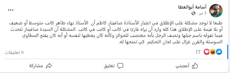 ونشر أسامة أبو العطا منشورا على صفحته قال فيه: طبعا لا توجد مشكلة على الإطلاق في اعتبار الأستاذة صافي ناز كاظم أن الأستاذ بهاء طاهر كاتب متوسط أو ضعيف أو بلا قيمة على الإطلاق، هذا كله وارد أن يراه قارئ في كاتب أو كاتب في كاتب، المشكلة إن السيدة صافي ناز تتحدث فيما تقوله باسم جيلها وتصف الرجل بأنه مغتصب للجوائز وكأنه كان يعطيها لنفسه أو أنه كان يفتح المطاوي السوستة والقرن غزال على لجان التحكيم كي تمنحها لها.
