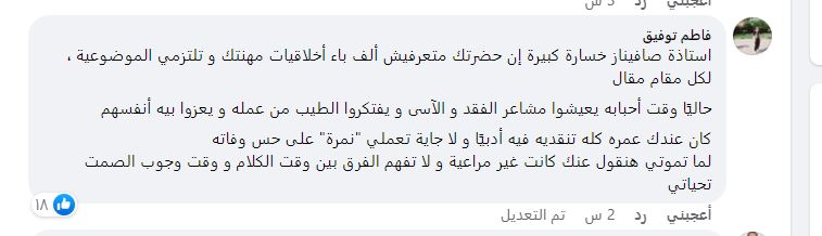فيما علق لها فاطم توفيق: أستاذة صافي ناز خسارة كبيرة إن حضرتك متعرفيش ألف باء أخلاقيات مهنتك وتلتزمي الموضوعية، لكل مقام مقال.. حاليًا وقت أحبابه يعيشوا مشاعر الفقد والأسى ويفتكروا الطيب من عمله ويعزوا بيه أنفسهم، مضيفا: كان عندك عمره كله تنقديه فيه أدبيًا ولا جاية تعملي نمرة على حس وفاته.. لما تموتي هنقول عنك كانت غير مراعية ولا تفهم الفرق بين وقت الكلام ووقت وجوب الصمت.