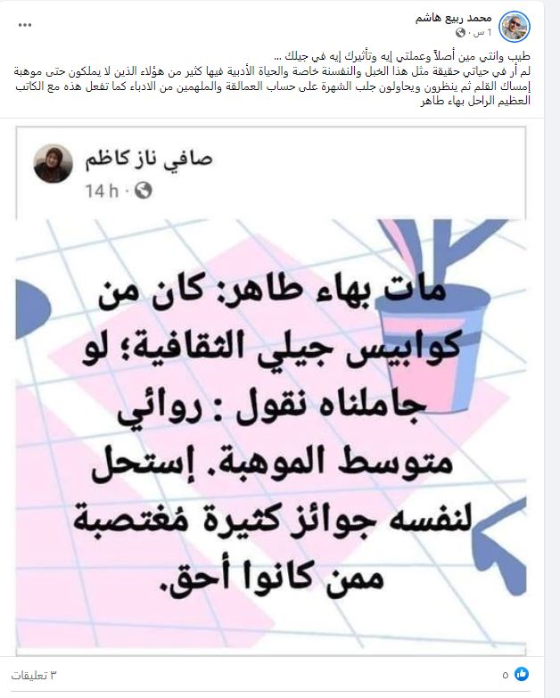 غضب عارم انتاب عدد من رواد موقع التواصل الاجتماعي فيسبوك بسبب هجوم الكاتبة صافي ناز كاظم على الكاتب الكبير الراحل بهاء طاهر، مؤكدين أن كلامها غير موفق.