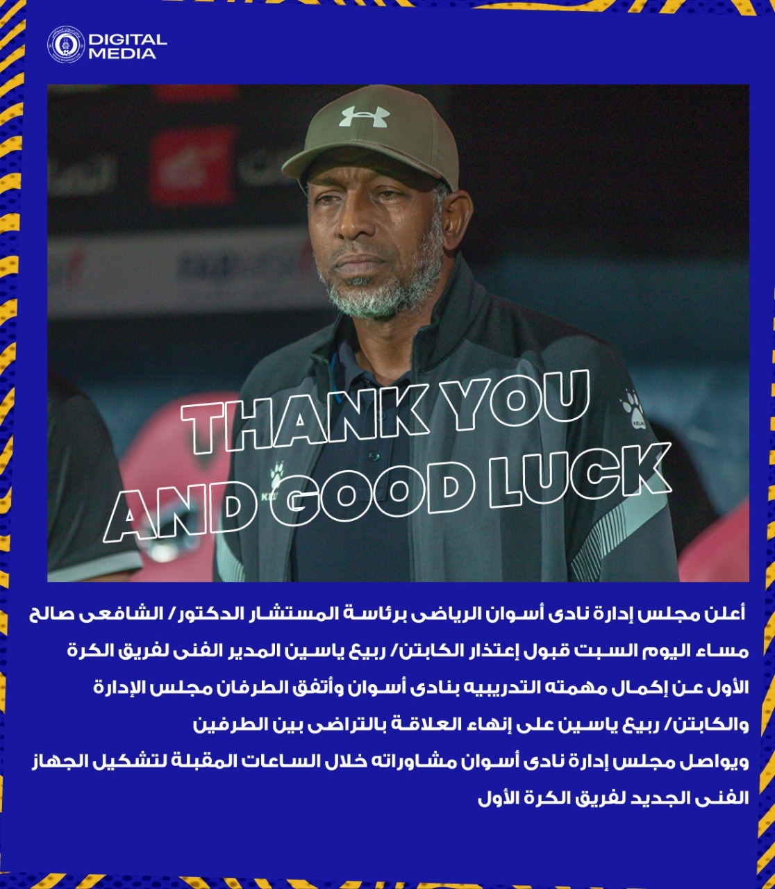 أعلن مجلس إدارة نادي أسـوان الرياضي برئاسة المستشار الدكتور الشافعي صالح، مساء اليوم السبت قبول اعتذار ربيع ياسين المدير الفني لفريق الكرة الأول عـن إكمال مهمته التدريبية بنادي أسوان، وأتفق الطرفان مجلس الإدارة وربيع ياسين على إنهاء العلاقة بالتراضي بين الطرفين.