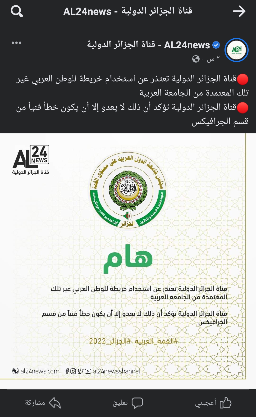 يأتي النفي في بيان للجامعة العربية، على خلفية قيام قناة الجزائر الدولية AL24 News بنشر خريطة للعالم العربي على موقعها الالكتروني تُخالف الخريطة التي درجت جامعة الدول العربية علي اعتمادها مما أثار تحفظ الوفد المغربي.