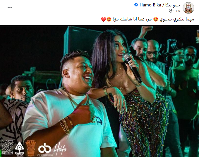 ونشر حمو بيكا، صورة جمعته بـ هيفاء وهبي، من إحدى حفلاتها التي أحيتها في الساحل الشمالي بموسم الصيف الماضي، وعلق قائلًا: مهما بتكبري بتحلوي.. في عنيا أنا شايفك مزة.