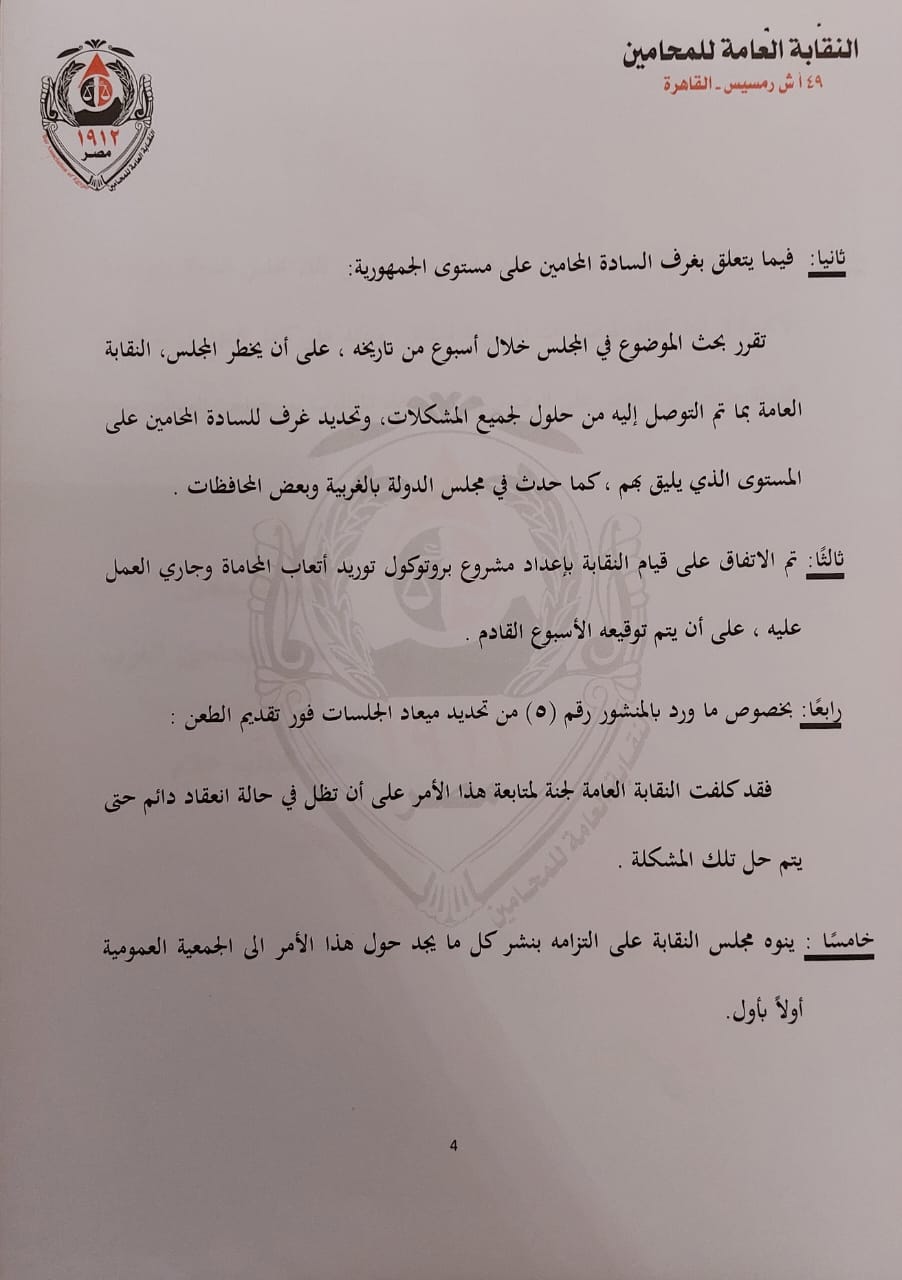 وفيما يتعلق بغرف المحامين على مستوى الجمهورية تقرر بحث الموضوع في المجلس خلال أسبوع من تاريخه، على أن يخطر المجلس، النقابة العامة بما تم التوصل إليه من حلول لجميع المشكلات، وتحديد غرف المحامين على المستوى الذي يليق بهم، كما حدث في مجلس الدولة بالغربية وبعض المحافظات.