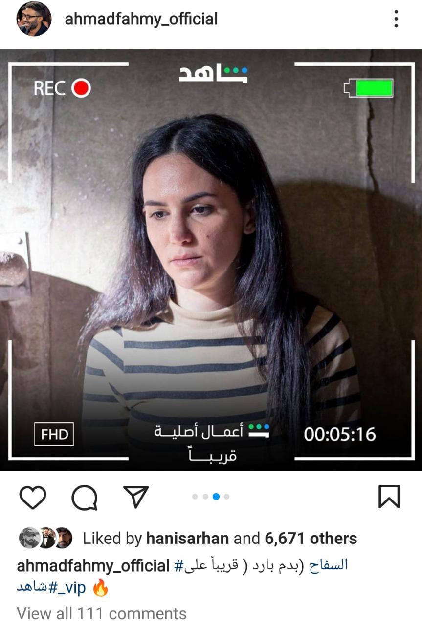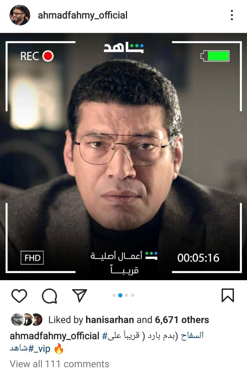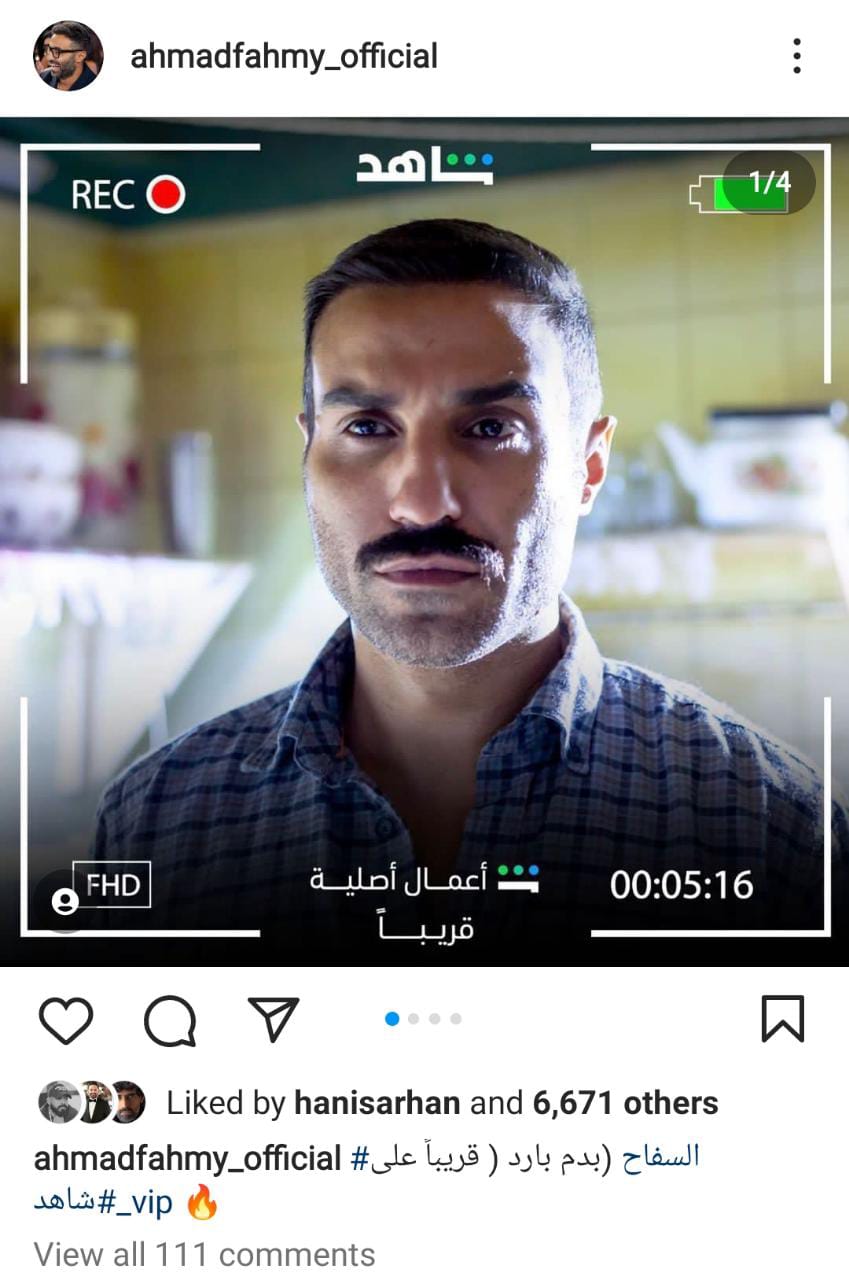 ونشر أحمد فهمي، صورة من البوستر الدعائي لمسلسله السفاح الذي ظهر من خلاله بـ لوك مختلف، وذلك عبر حسابه الشخصي بموقع تبادل الصور والفيديوهات انستجرام، وعلق قائلًا: السفاح (بدم بارد).. قريبًا على شاهد VIP.