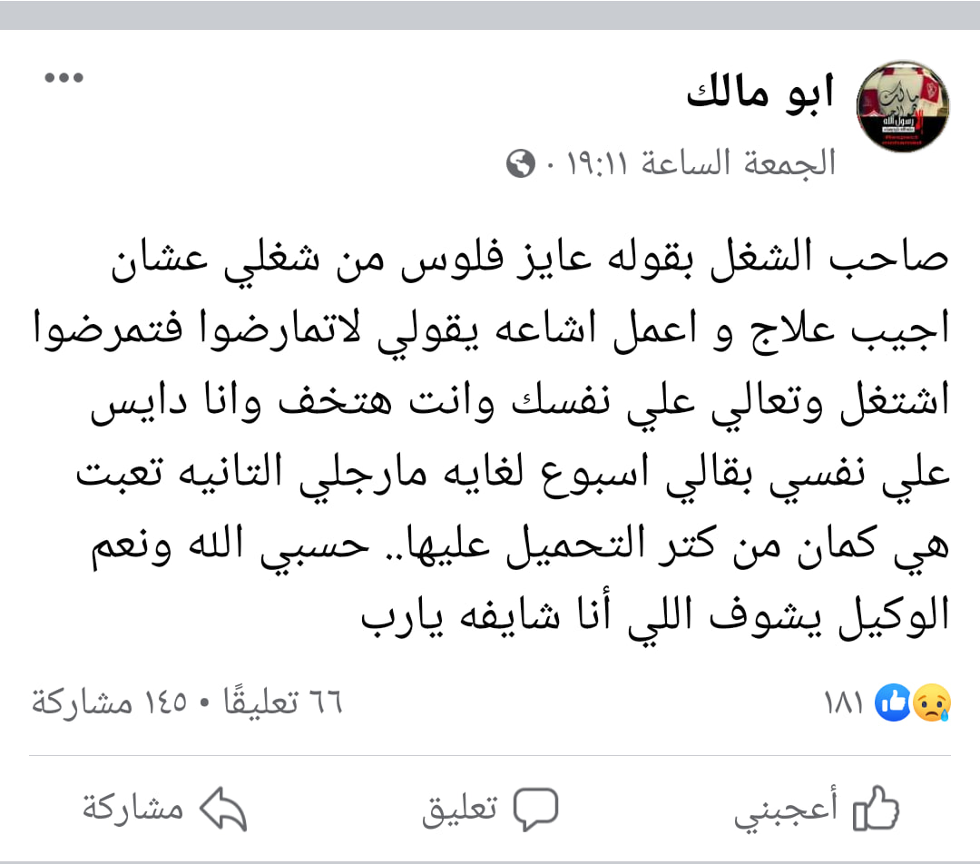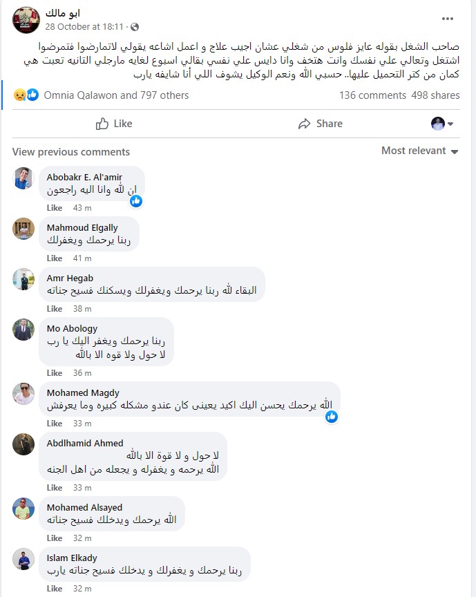 كان المتوفى ويدعى محمد وشهرته أبو مالك، قد نشر على صفحته الشخصية، بموقع التواصل الاجتماعي فيس بوك، الحوار الذي دار بينه وبين مديره بالعمل، حول مرضه وحاجته للأموال.