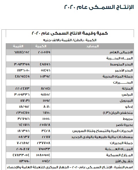 وحسب الجهاز المركزي للتعبئة العامة والإحصاء، بلغ الإنتاج السمكي 2 مليون طن عام 2019، حيث احتلت المزارع السمكية المرتبة الأولى من حيث الإنتاج، حيث بلغت نسبتها 79٫7 % يلـيه إنتـاج البحيرات بنسبة 10٫8%، ثم إنتـاج المياه البحـريـة بنسبة 4٫9%، وفي المياه العذبة بنسبة 3٫8%، وأخيرًا حقول الأرز بنسبة 0٫8% من إجمالى الإنتاج.