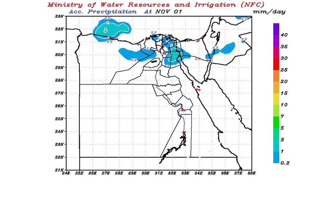 وأوضح مركز التنبؤ بالفيضان، أن اليوم الثلاثاء 1 نوفمبر سيشهد سقوط أمطار خفيفة على السواحل الشمالية ومناطق متفرقة من الوجه البحري والقاهرة.