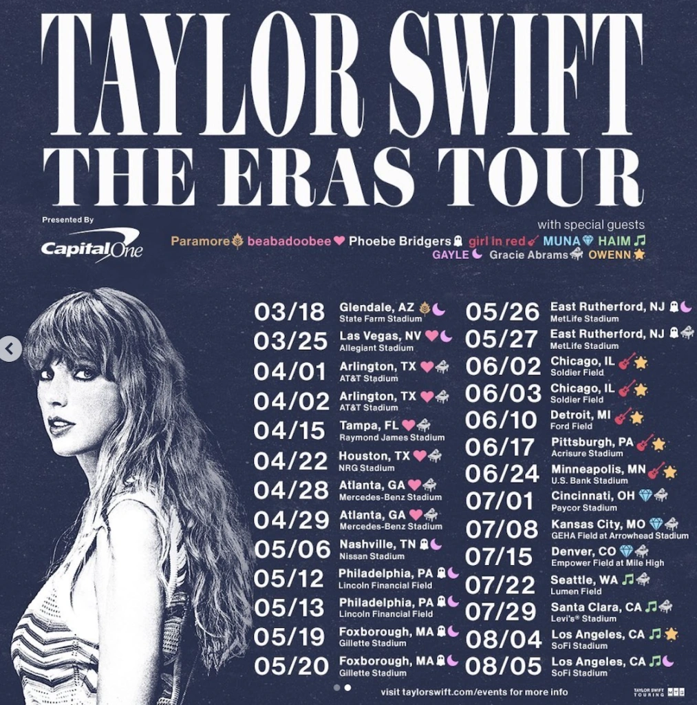 وجاء إعلان تايلور سويف عن جولتها الغنائية، بعد النجاح الكبير الذي حققته من خلال ألبومها الجديد Midnights، حيث أعلنت مجلة بيلبورد عن قائمة أفضل 10 أغاني لهذا الأسبوع، وسيطرت المغنية تايلور وسيفت على القائمة بأكملها، ويعد ذلك بمثابة حدث تاريخي.