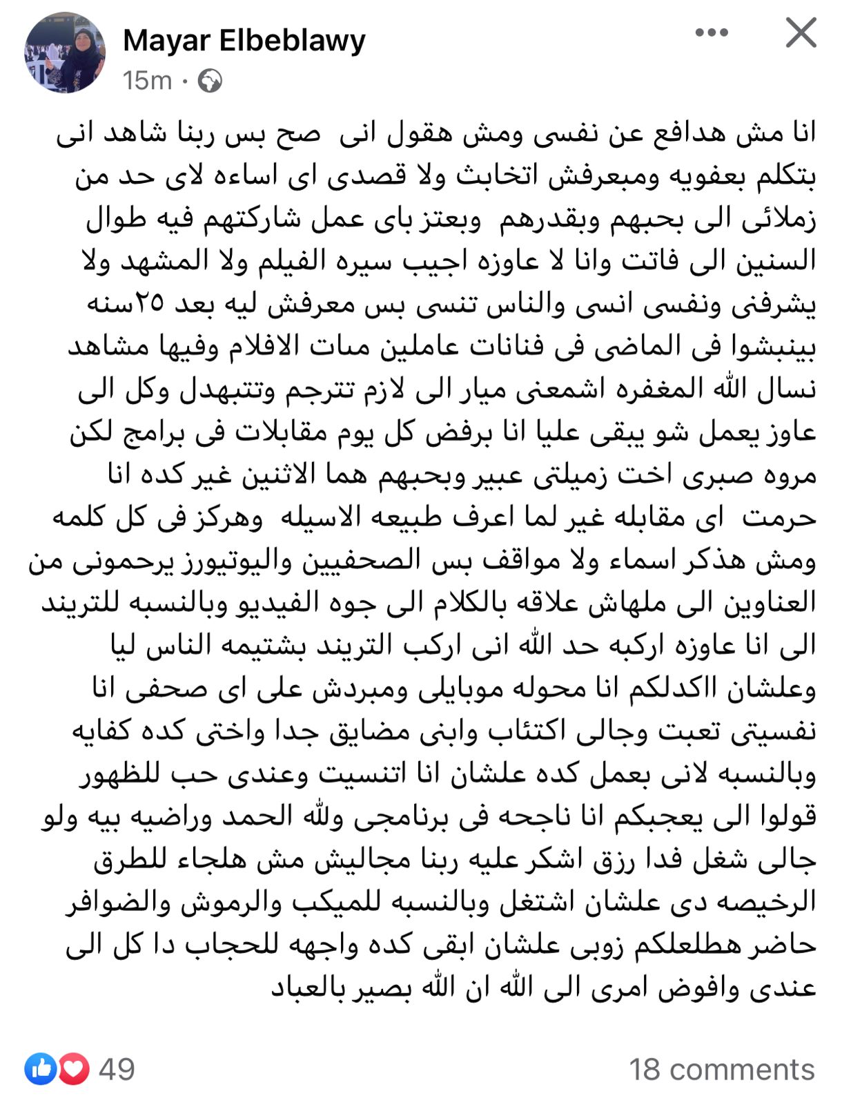 وكتبت ميار الببلاوي، منشورًا عبر حسابها الشخصي بموقع التواصل الاجتماعي فيسبوك، وقالت: أنا مش هدافع عن نفسي ومش هقول إني صح بس ربنا شاهد إني بتكلم بعفوية ومبعرفش اتخابث، ولا قصدي أي إساءة لأي حد من زملائي اللي بحبهم وبقدرهم وبعتز بأي عمل شاركتهم فيه طوال السنين اللي فاتت، وأنا لا عاوزة أجيب سيرة الفيلم ولا المشهد ولا يشرفني ونفسي أنسى.