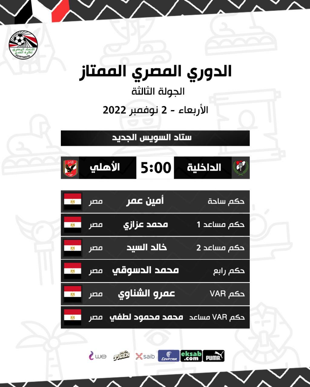 طاقم تحكيم مباراة الأهلي والداخلية في الدوري