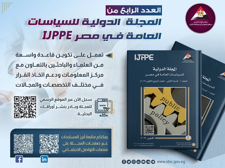 أعلن مركز المعلومات ودعم اتخاذ القرار التابع لمجلس الوزراء، عبر صفحته الرسمية على فيسبوك، صدور العدد الرابع من المجلة الدولية للسياسات العامة في مصر، وهي مجلة دولية مُحكمة ذات رقم تسلسلي قياسي دولي، يُصدرها المركز بدورية ربع سنوية، وتختص بنشر البحوث والدراسات المُتعلقة بمجالات السياسات العامة المختلفة، ورصد آخر التطورات في ذلك الشأن، ويُسهم فيها باحثون وكتَّاب محليون ودوليون لهم خبرة ودراية موضوعية.