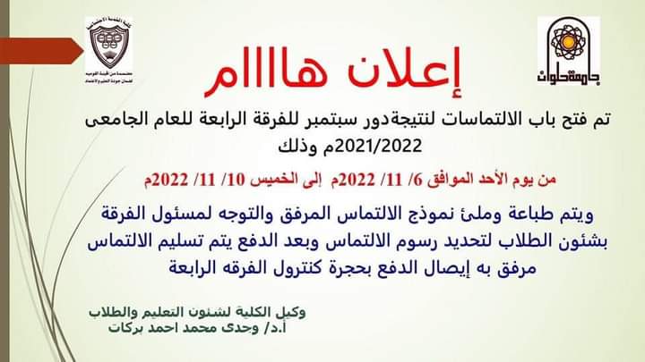 خدمة اجتماعية حلوان تفتح باب الالتماسات لنتيجة دور سبتمبر لطلاب الفرقة الرابعة