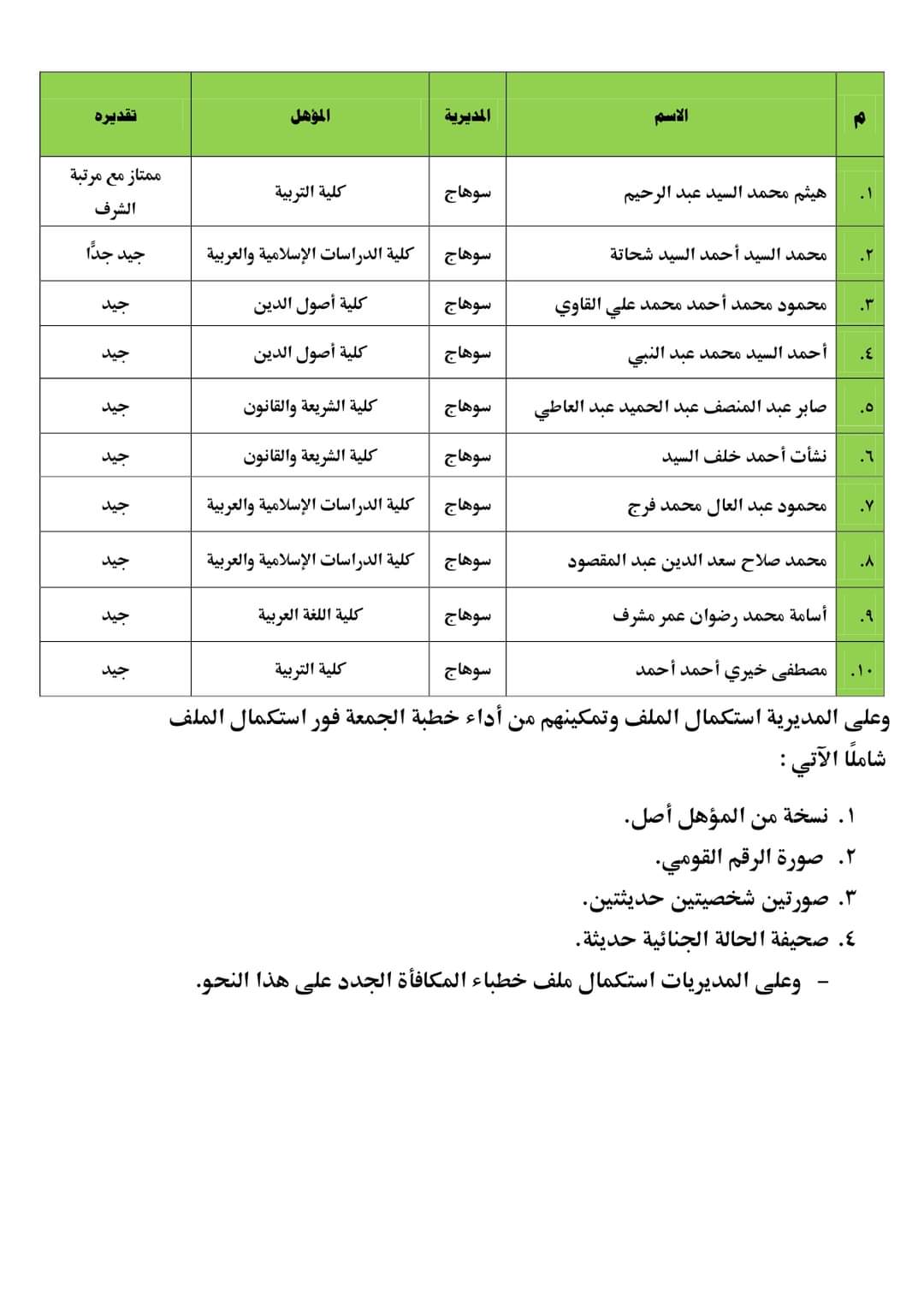 وقال وزير الأوقاف، عبر صفحته الرسمية بموقع التواصل الاجتماعي فيس بوك، يسُرُّنا أن ننشر أسماء الناجحين من محافظة سوهاج المتقدمين للخطابة بالمكافأة على بند التحسين من خريجي الكليات الشرعية والعربية - المجموعة الرابعة - 2022م، وسننشر تباعًا أسماء باقي الناجحين ممن تم امتحانهم من المحافظات الأخرى، وهم: