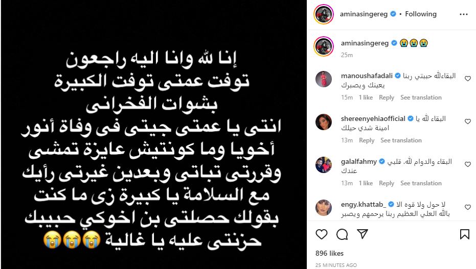 وكتبت أمينة منشورًا عبر حسابها الرسمي بـ انستجرام قالت فيه: إن لله وإن إليه راجعون، توفيت عمتي الكبيرة بشوات الفخراني انتي ياعمتي جيتي في وفاة أنور أخويا ومكنتيش عايزة تمشي.