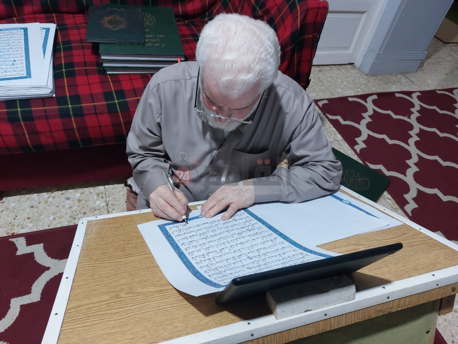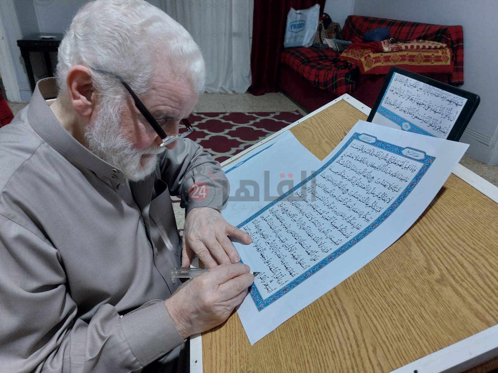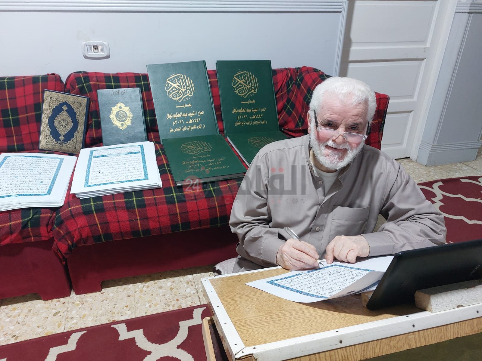 داخل شقة صغيرة بقرية الشندلات بمركز السنطة بمحافظة الغربية، يجلس السيد عبد الحكيم نوفل، البالغ من العمر 70 عاما، منحنيا على ترابيزة، مرتديا نظارته المكبرة أمامه جهاز لاب توب وأوراق أعدها لكتابة القرآن الكريم، يقرأ الآيات ثم يكتبها بدقة شديدة في الأوراق، وبعد أن ينتهي من كتابة الآية ينقل التشكيل كما هو موجود باللاب.