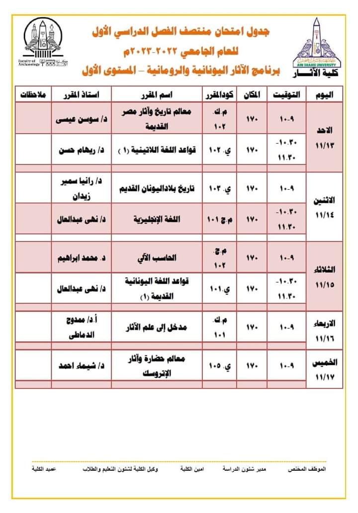 تستعد كلية الآثار بـ جامعة عين شمس لإجراء امتحانات منتصف الفصل الدراسي الأول للعام الدراسي الجامعي الجديد 2022-2023 لجميع برامج الكلية، وذلك تطبيقًا لما ورد في مواد اللائحة الداخلية للكلية التي تنص المادة 14 منها على عقد هذا الاختبار خلال الأسبوع السابع من الدراسة على أن يُخصص له 10 درجات.