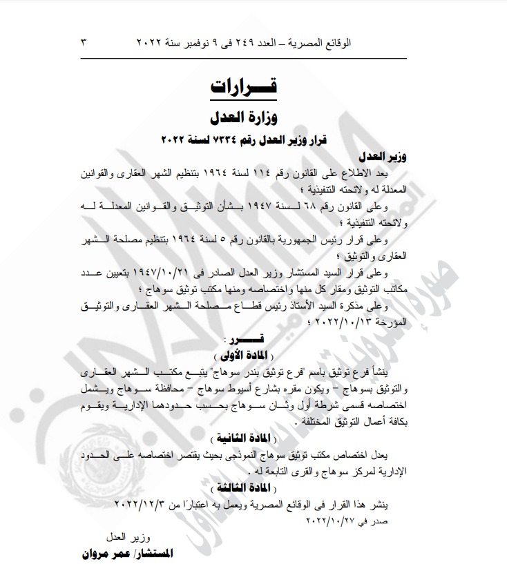 نشرت الجريدة الرسمية قرار وزير العدل المستشار عمر مروان، الذي حمل رقم 7334 لسنة 2022، بشأن تعيين عدد مكاتب التوثيق ومقار كل منها واختصاصه ومنها مكتب توثيق سوهاج.