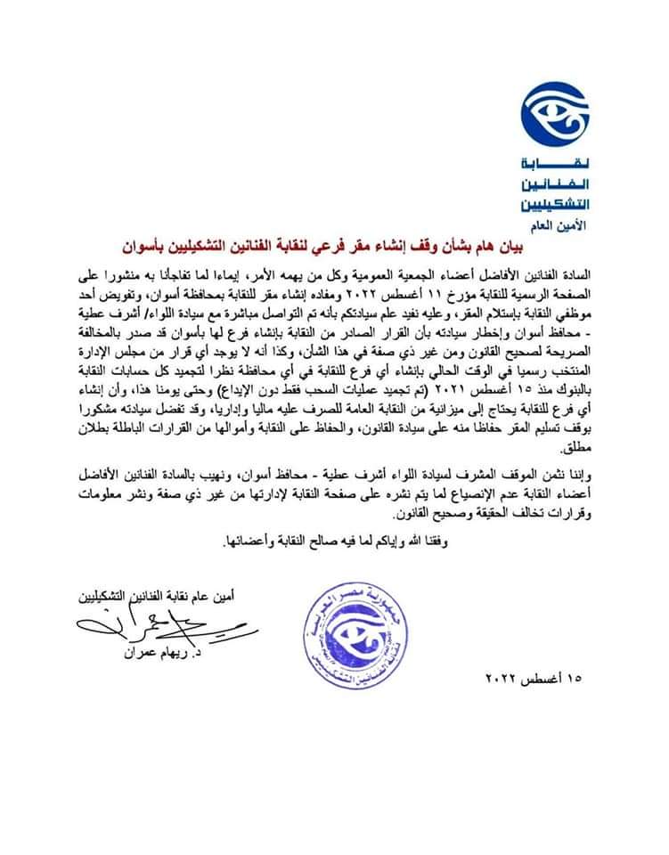 وذكرت أنه تم إلغاء قرار تسليم النقيب صفية القباني، مقر النقابة في محافظة أسوان في يوم 11 أغسطس 2022 بناءً على شكوى من الأمين العام ومجلس الإدارة لمحافظ أسوان اللواء أشرف عطيه.
