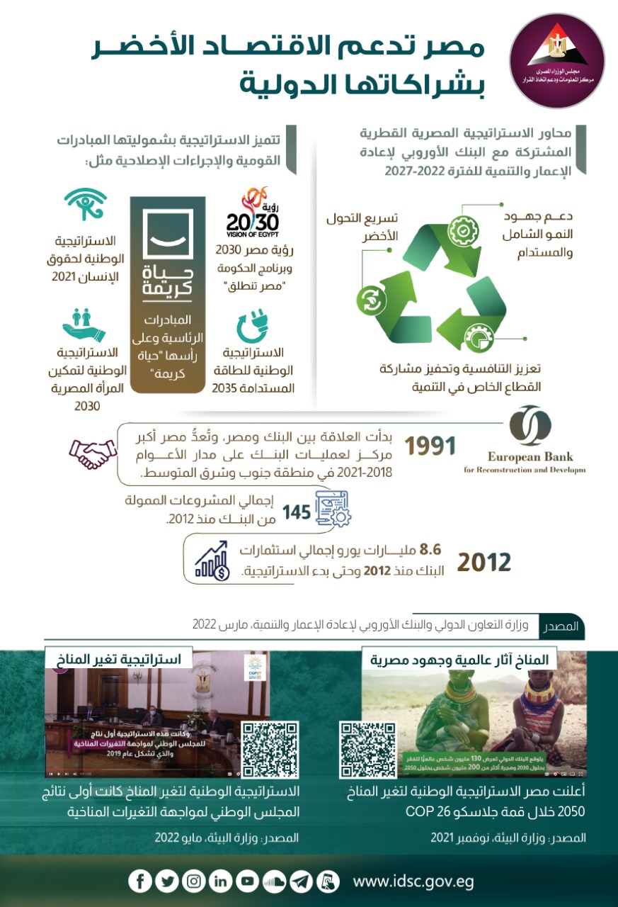 وبمناسبة اليوم المخصص للتمويل بمؤتمر المناخ، جاء انفوجراف معلومات الوزراء بعنوان: مصر تدعم الاقتصاد الأخضر بشراكاتها الدولية، يسلط فيه الضوء على الجهود المصرية في تفعيل الشراكات الدولية من أجل تحقيق الأهداف التنموية، ومن أبرزها الاستراتيجية المصرية القطرية المشتركة مع البنك الأوروبي لإعادة الإعمار والتنمية للفترة 2022-2027.