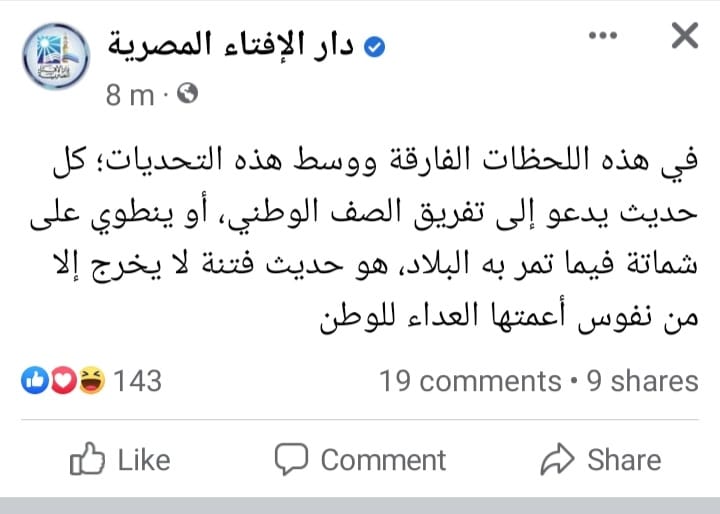 وقالت دار الإفتاء في منشورها، إنه في هذه اللحظات الفارقة ووسط هذه التحديات؛ كل حديث يدعو إلى تفريق الصف الوطني، أو ينطوي على شماتة فيما تمر به البلاد، هو حديث فتنة لا يخرج إلا من نفوس أعماها العداء للوطن.