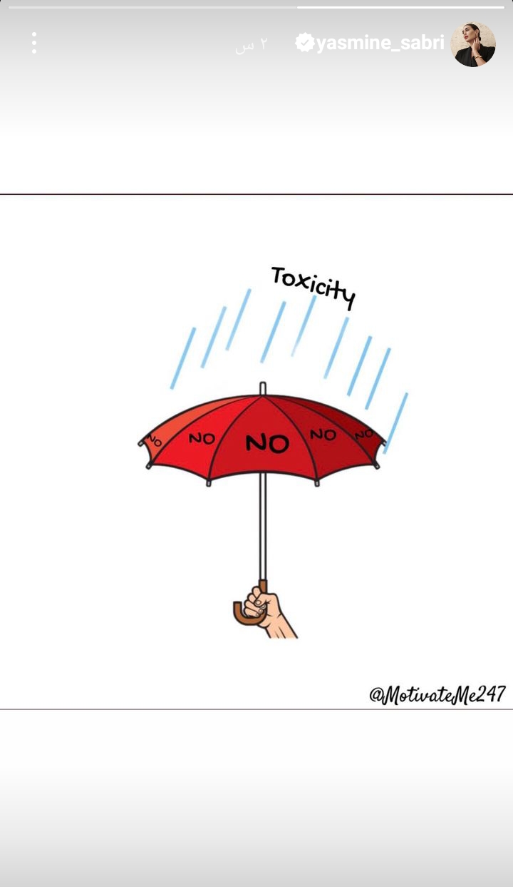 ونشرت ياسمين صبري، الصورة عبر حسابها الشخصي بموقع إنستجرام، ظهر فيها جميلة توكسيك، وتعني الابتعاد عن العلاقات السامة، ما دفع متابعوها عبر مواقع التواصل الاجتماعي للتساؤل حول هل تقصد بذلك شيرين عبد الوهاب؟.