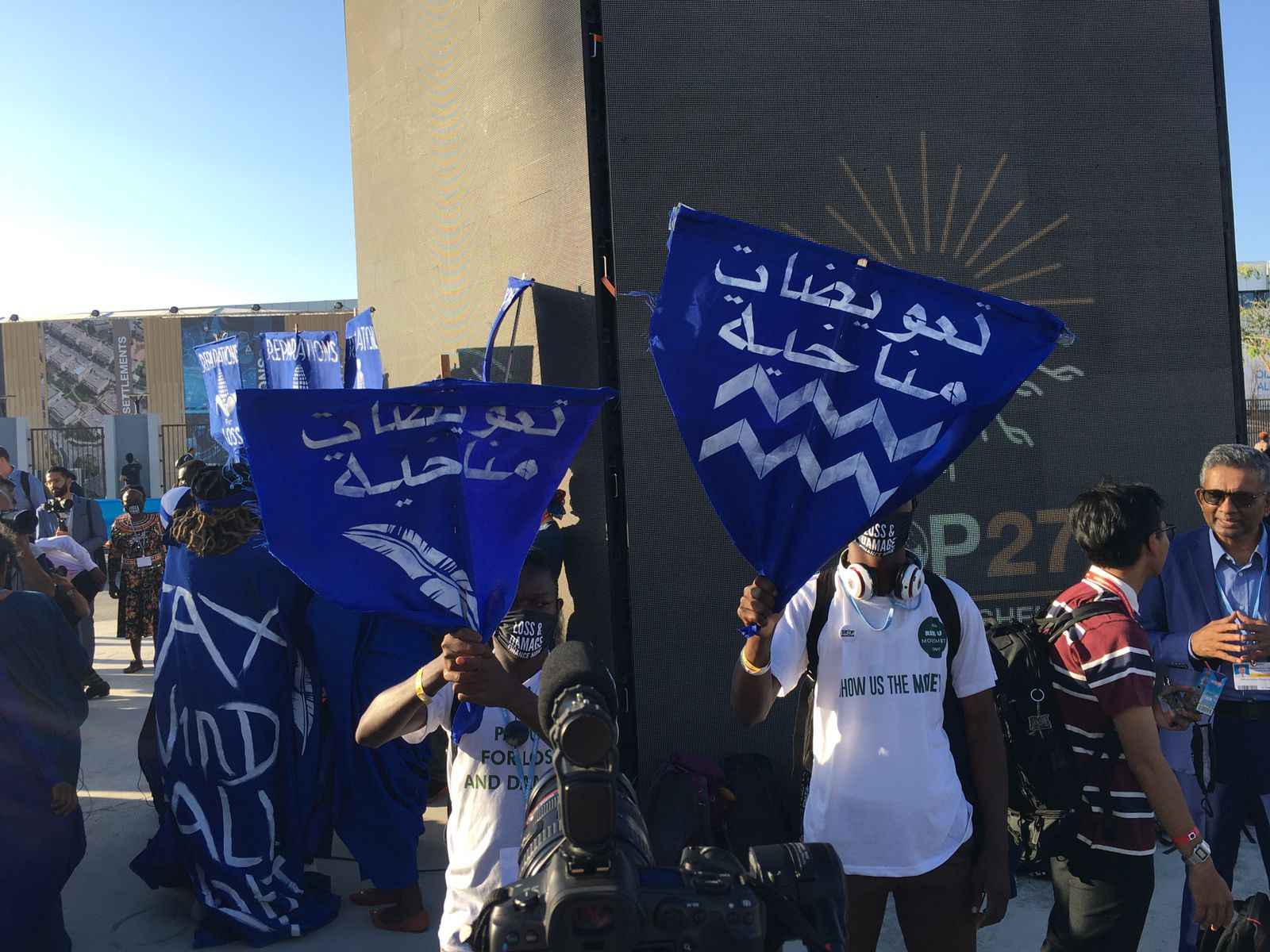 وحمل المتظاهرون، أعلاما ولافتات زرقاء، وارتدوا غطاء أسود للفم والأنف أسود اللون وكتب على الأعلام الزرقاء واللافتات عبارات: التعويض عن فقدان سبل العيش وتعويضات مناخية، فيما طبعوا على الـ ماسك عبارة لخسائر والأضرار.. الفرصة الآن.