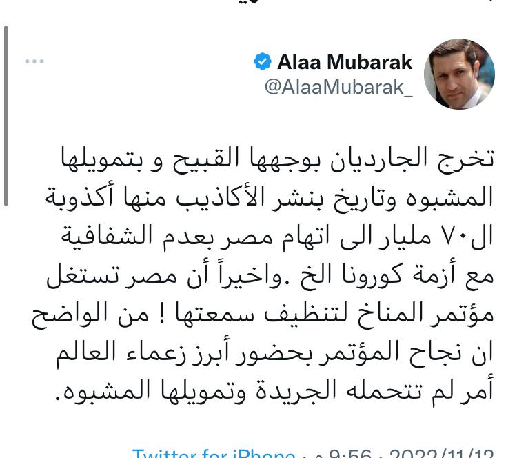 وأضاف علاء مبارك خلال تدوينة له على موقع التواصل الاجتماعي تويتر: وأخيرًا أن مصر تستغل مؤتمر المناخ لتنظيف سمعتها، من الواضح أن نجاح المؤتمر بحضور أبرز زعماء العالم أمر لم تتحمله الجريدة وتمويلها المشبوه.
