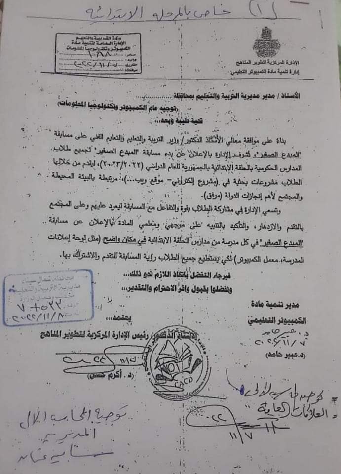 عمممت الإدارة المركزية لتطوير المناهج بوزارة التربية والتعليم والتعليم الفني، منشورًا يفيد بإعلان بدء مسابقة المبدع الصغير في جميع مدارس الجمهورية، وذلك لعمل مشروعات خاصة عن أهم إنجازات الدولة بالبيئة المحيطة للطالب.