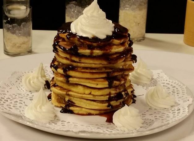 - بعد انتهاء كمية عجينة البان كيك سيتم وضعه في طبق التقديم وتزيينه بالفواكه والعسل.