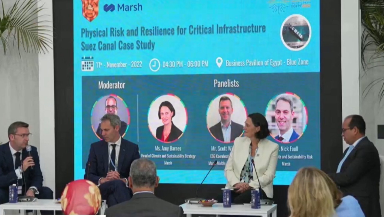 وناقشت الورشة الثالثة بالتعاون مع شركة مارش المخاطر المادية وقدرة البنية التحتية الحيوية على الصمود: قناة السويس كنموذج للدراسة بحضور هيثم طاهر نائب رئيس مجلس الإدارة لشركة متلايف وإيمى بارنس رئيس استراتيجية المناخ والاستدامة بمؤسسة مارش، وسكوت وليامز مدير تنسيق شئون حوكمة الاستدامة الثلاثية بمؤسسة مارش ونك فاول (رئيس وحدة أخطار المناخ والاستدامة بمؤسسة مارش