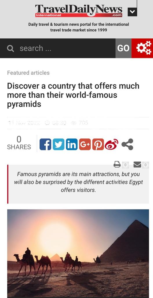 كما أشار الموقع إلى أن المقصد السياحي المصري به جزر ومواقع أثرية وسواحل تمتد على البحرين المتوسط والأحمر إلى جانب نهر النيل، ولذا فإن هناك عدد لا حصر له من الأنشطة التي يمكن القيام بها في هذه الأماكن، بالاضافة الي الأهرامات والمعابد الأثرية والمومياوات الرائعة.