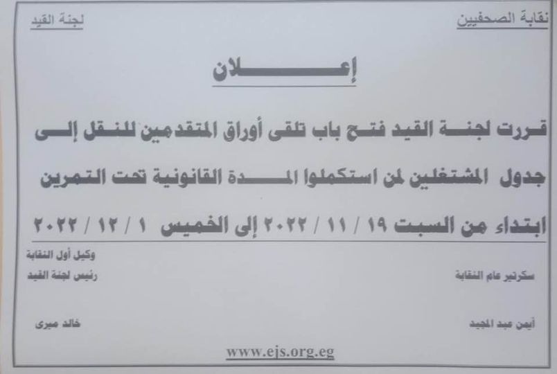 أعلنت لجنة القيد بنقابة الصحفيين، فتح باب تلقي أوراق المتقدمين للنقل إلى جدول المشتغلين لمن استكملوا المدة القانونية تحت التمرين.