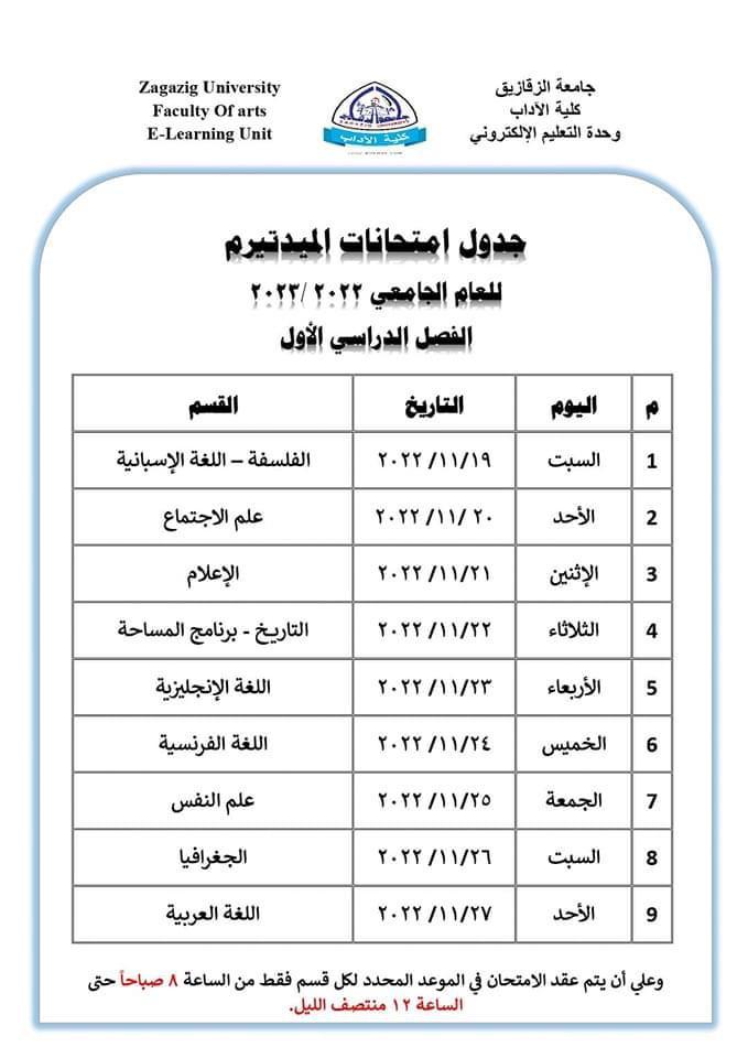 جداول امتحانات الميدتيرم لطلاب آداب الزقازيق
