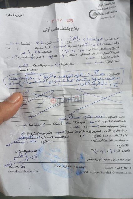 وأشارت السيدة المجني عليها إلى أنها انتقلت إلى المستشفى الهرم العام، وتم اسعافها وبتقديم العلاج اللازم لها، مشيرة إلى أنها أصيبت إصابات في الوجه والكتف والرقبة نتيجة التعدي عليها.