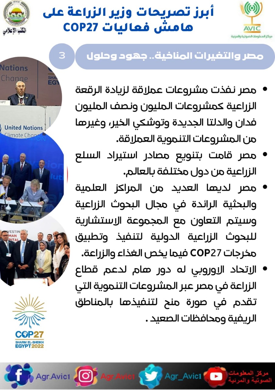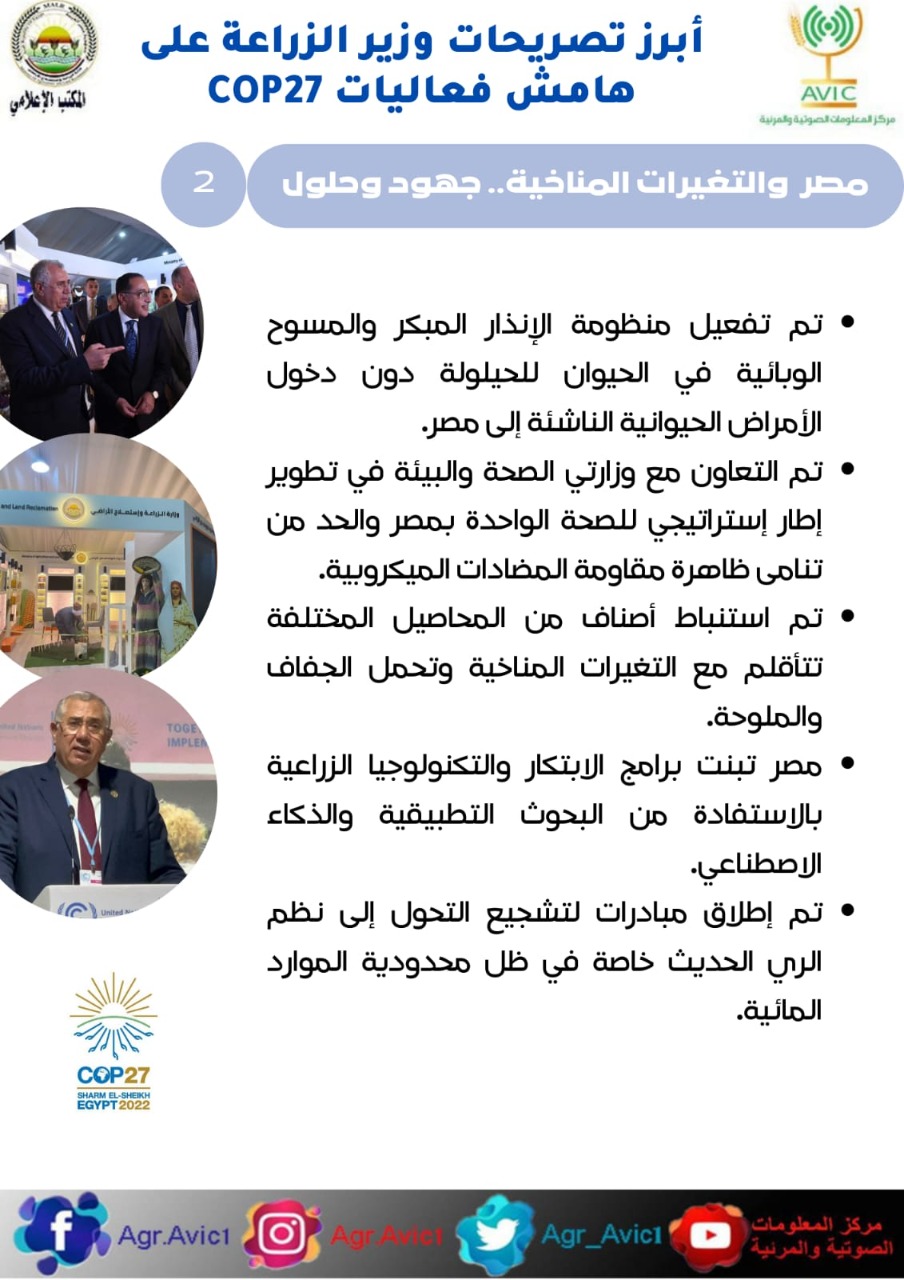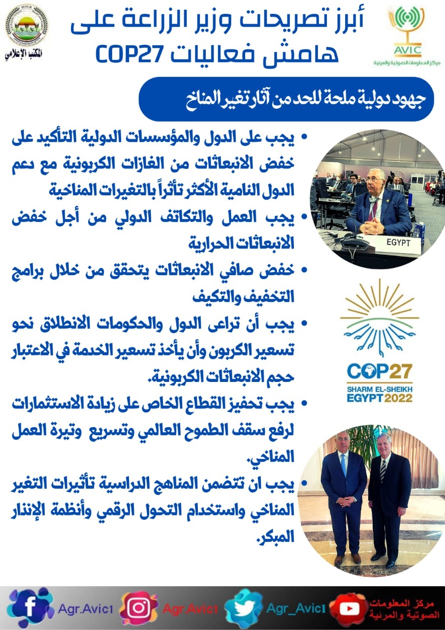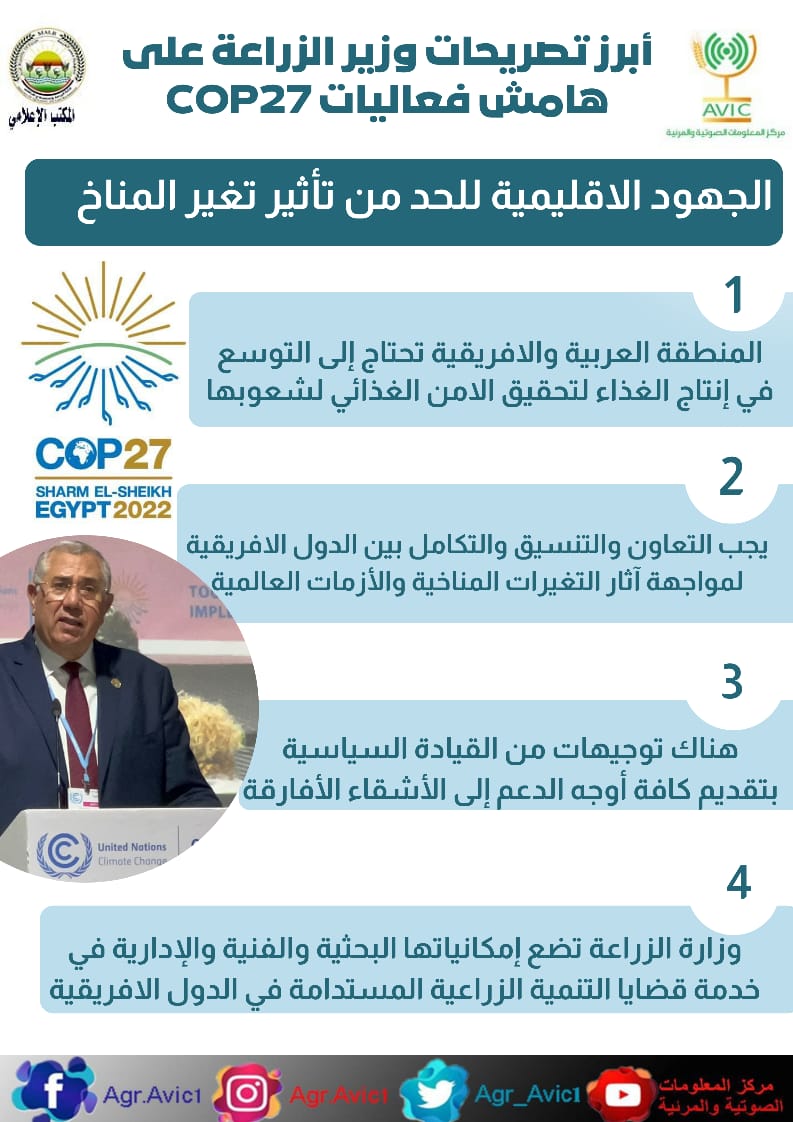 وأشار الانفوجراف، إلى أن وزير الزراعة أكد خلال المؤتمر، أن تغير المناخ قضية عالمية، ويجب أن يكون هناك جهود دولية ملحة للحد من آثار تغير المناخ، ووضع خطة لمعرفة سبل مواجهة التحديات.