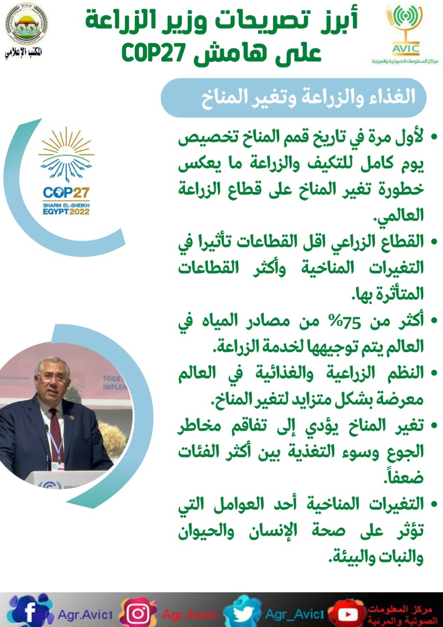 نشر مركز المعلومات الصوتية والمرئية بوزارة الزراعة واستصلاح الأراضي، والمكتب الإعلامي للوزارة، أهم رسائل السيد القصير وزير الزراعة واستصلاح الأراضي، خلال مشاركته في فعاليات مؤتمر قمة المناخ COP27، والذي استضافته جمهورية مصر العربية بمدينة شرم الشيخ.