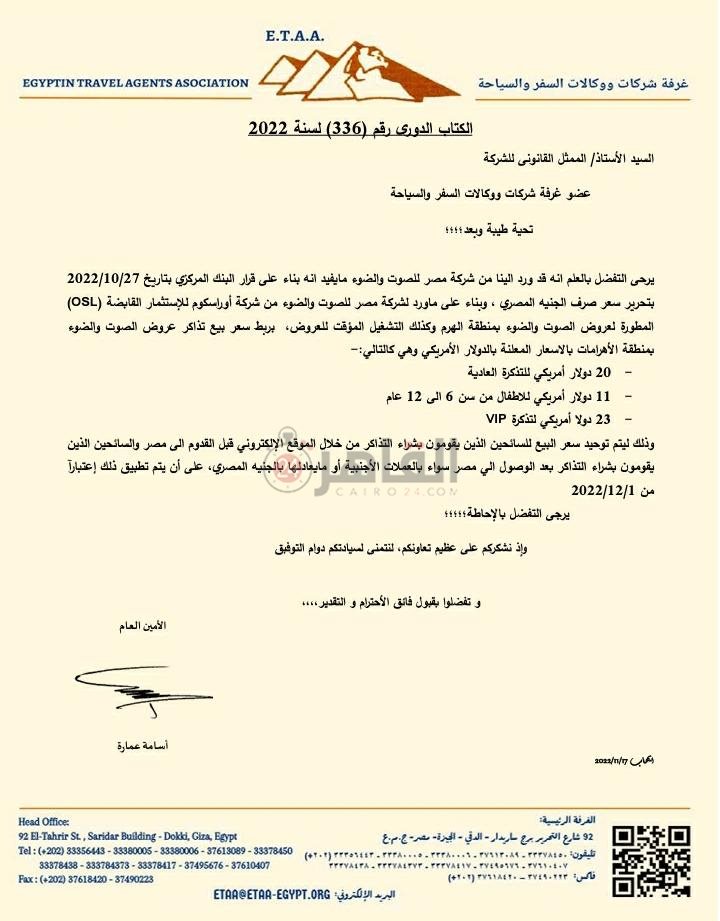 أصدر أسامة عمارة، الأمين العام لغرفة شركات السياحة، خطابا رسميًا لشركات السياحة؛ بشأن أسعار تذاكر الصوت والضوء الجديدة، بعد ارتفاع أسعار الدولار.