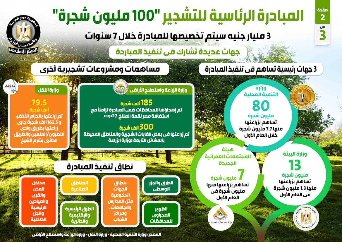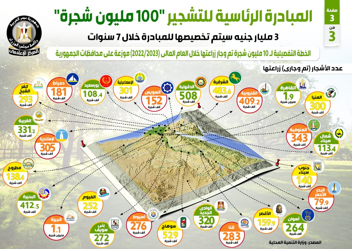نشر المركز الإعلامي لمجلس الوزراء تقريرًا تضمن انفوجراف؛ سلّط الضوء على المبادرة الرئاسية للتشجير 100 مليون شجرة، والتي سيتم تخصيص 3 مليارات جنيه لها خلال 7 سنوات.