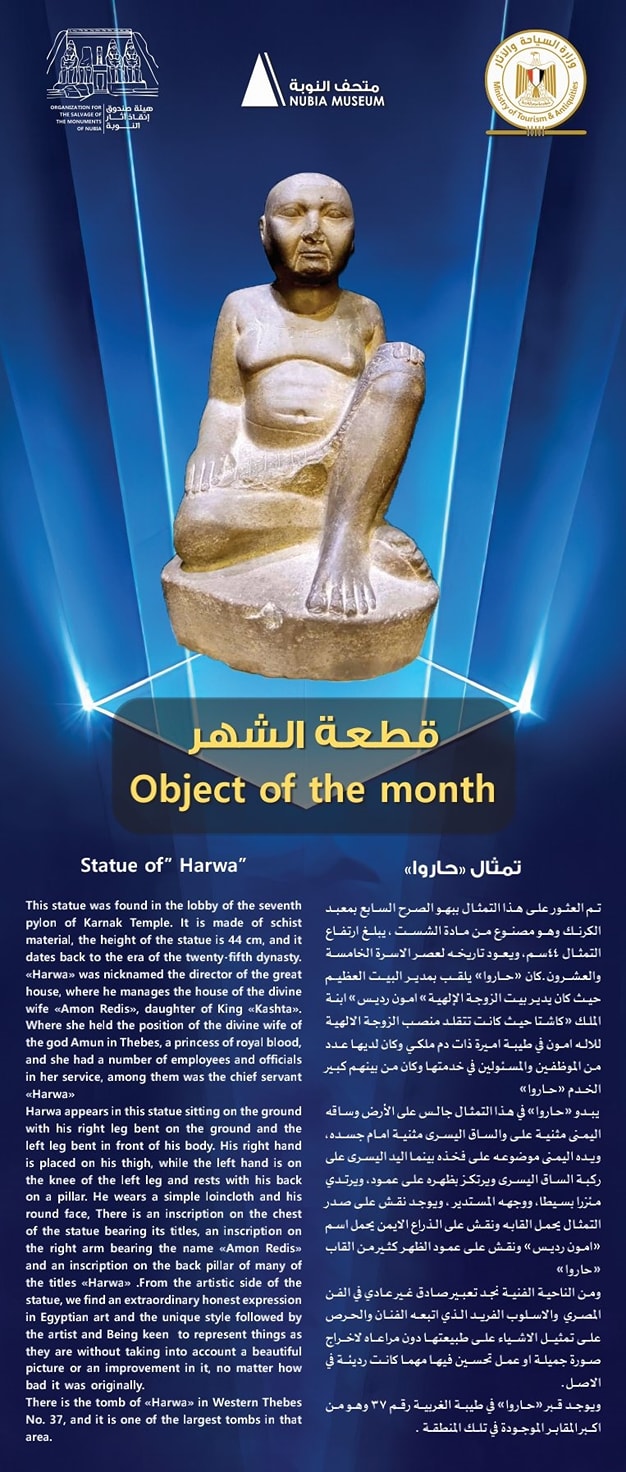 أعلن متحف النوبة عرض قطعة أثرية فريدة لـ تمثال حاروا مدير بيت الزوجة الإلهية، والمصنوع من مادة الشست.