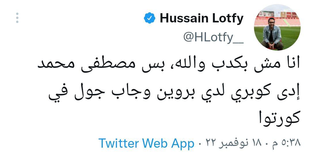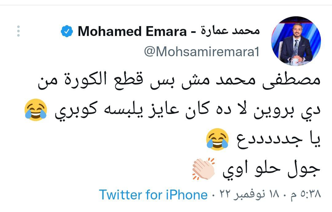 وقال عبد القادر سعيد: هدف عالمي من مصطفى محمد في كورتوا.. رقّص دي بروين بحرفنة وشاطها زي ما الكتاب بيقول، وتفاعل مع الهاشتاج كريم راتب فقال: لا دي مش فوتوشوب، أيوة مصطفى محمد حط كوبري في دي بروين.