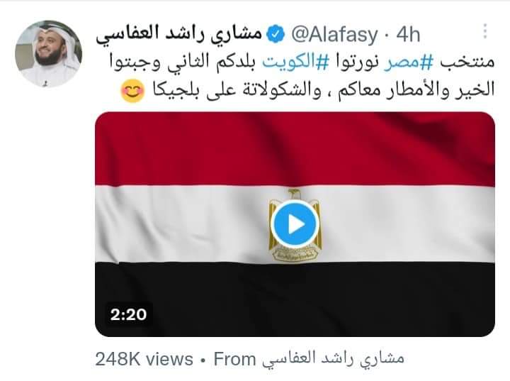 نشر الداعية الإسلامي مشاري راشد العفاسي صورة له من مدرجات مباراة مصر وبلجيكا التي أقيمت على أرضية ستاد جابر الأحمد في الكويت، وانتهت منذ قليل بهدفين مقابل هدف وحيد لصالح الفراعنة.