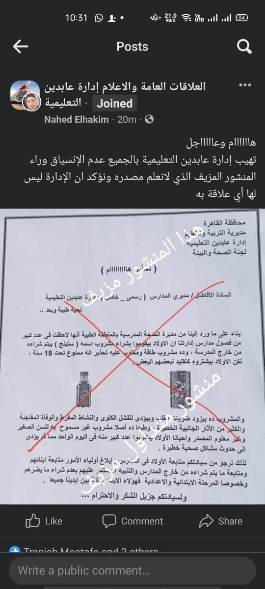 تأكيدًا للقاهرة 24.. إدارة عابدين التعليمية تتبرأ من مستند مشروبات الطاقة