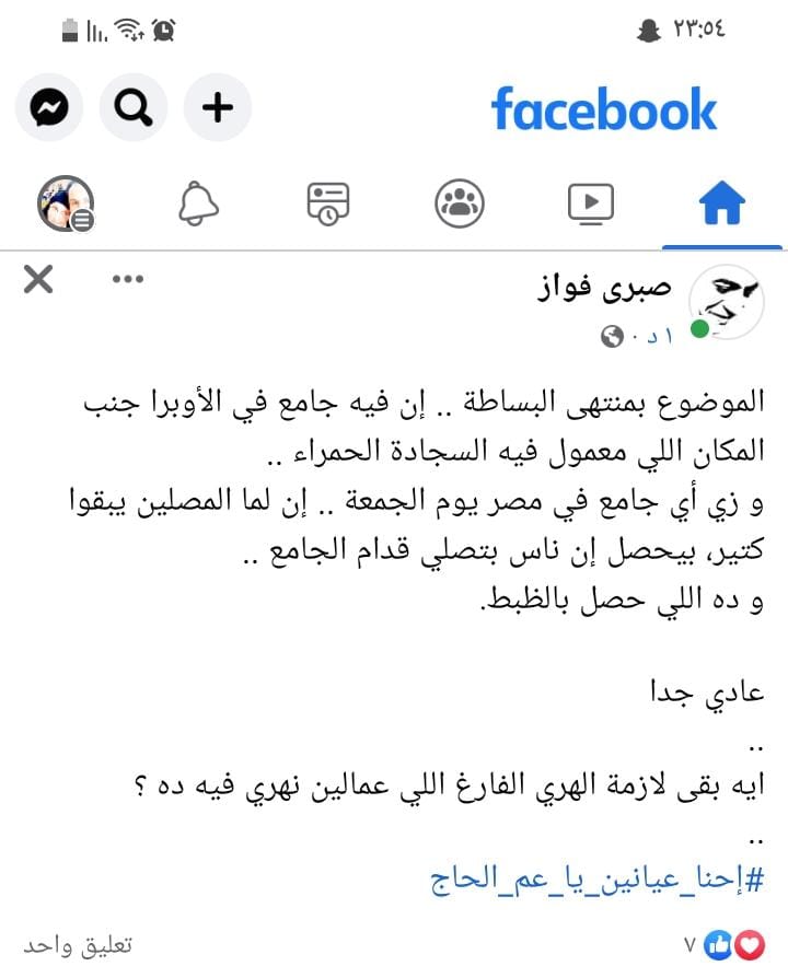 وقال الفنان صبري فواز: الموضوع بمنتهى البساطة إن فيه جامع في الأوبرا جنب المكان اللي معمول فيه السجادة الحمراء، وزي أي جامع في مصر يوم الجمعة، إن لما المصلين يبقوا كتير، بيحصل إن ناس بتصلي قدام الجامع، وده اللي حصل بالظبط.