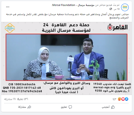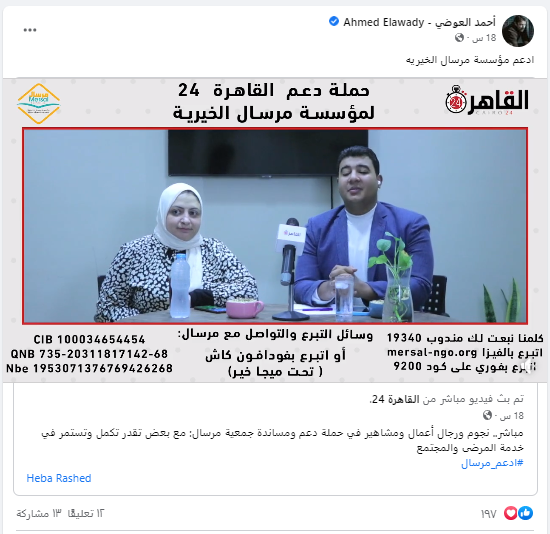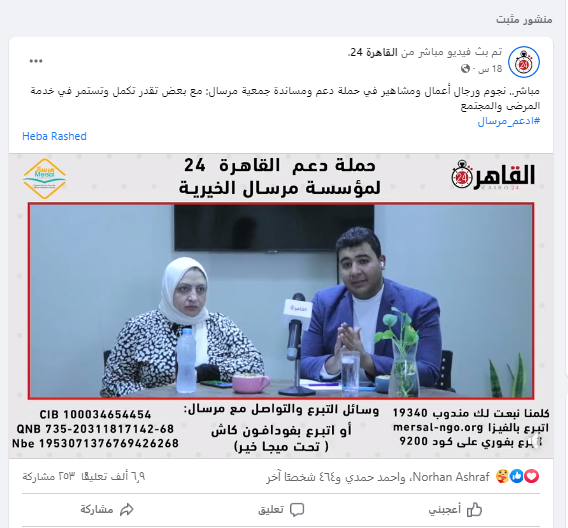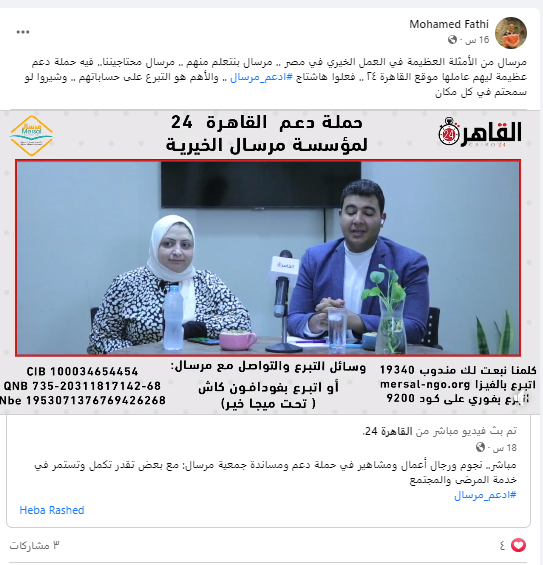 بينما قالت مرسال عبر صفحتها الرسمية على موقع فيس بوك: صفحة القاهرة 24 قررت تدعم مرضى مؤسسة مرسال عشان أزمة التبرعات الموجودة حاليًا واللي بتأثر بشكل كبير على حياة مرضى كتير مستنين علاجهم وخدمتهم الطبية من مرسال.