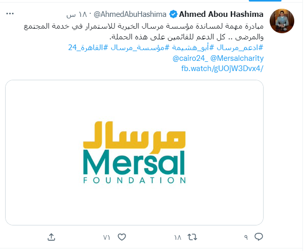 رجل الأعمال أحمد أبو هشيمة، عبر عن دعمه لحملة القاهرة 24، للتبرع لـ مؤسسة مرسال الخيرية، وذلك من خلال منشور له على موقع التواصل الاجتماعي، تويتر، قائلا: مبادرة مهمة لمساندة مؤسسة مرسال الخيرية للاستمرار في خدمة المجتمع والمرضى، كل الدعم للقائمين على هذه الحملة.