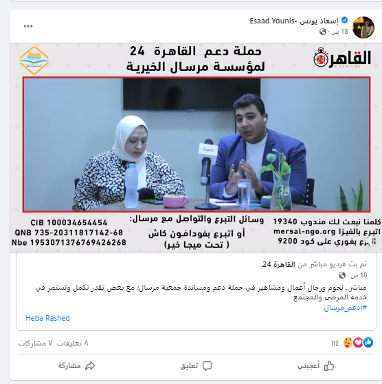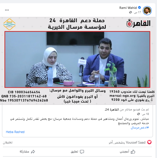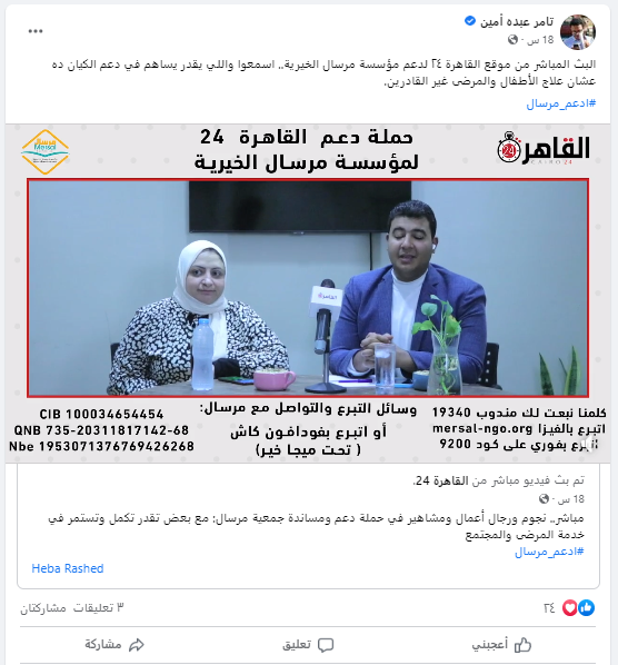 من جانبه دعا الكاتب تامر عبده أمين للتبرع لـ مؤسسة قائلًا: البث المباشر من موقع القاهرة 24 لدعم مؤسسة مرسال الخيرية.. اسمعوا واللي يقدر يساهم في دعم الكيان ده عشان علاج الأطفال والمرضى غير القادرين.