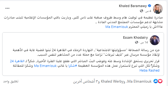 وعبر الكاتب الصحفي خالد البرماوي عن ترحيبه بالمبادرة التي أطلقها موقع القاهرة 24 موضحًا أنها تأتي في توقيت مهم، حيث قال: مبادرة عظيمة في توقيت هام وسط ظروف صعبة على ناس كتير.. وياريت باقي المؤسسات الإعلامية تتبنى مبادرات مشابهة لدعم مؤسسات المجتمع المدني الجادة.