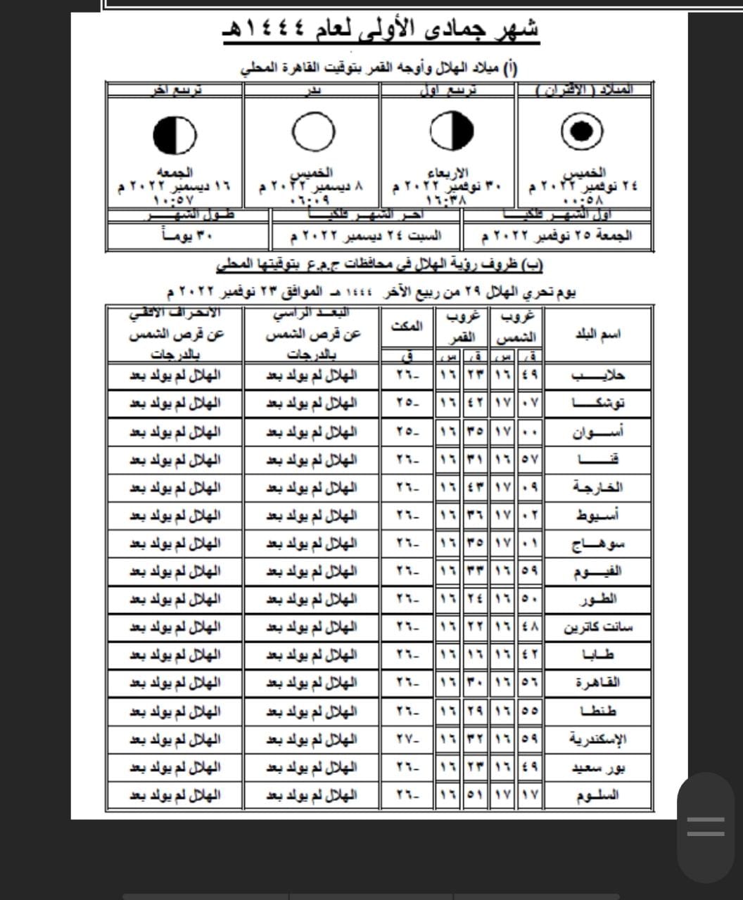 صرح الدكتور جاد القاضي، رئيس المعهد القومي للبحوث الفلكية والجيوفيزيقية بأنه طبقا للحسابات الفلكية، التي يقوم بها معمل أبحاث الشمس بالمعهد، فإن هلال شهر جمادى الأولى سيولد مباشرة بعد حدوث الاقتران في تمام الدقيقة 58 صباحًا، بتوقيت القاهرة المحلي، يوم الخميس 30 من ربيع الآخـر1444هـ، 24/11/2022م (اليوم التالي للرؤية).