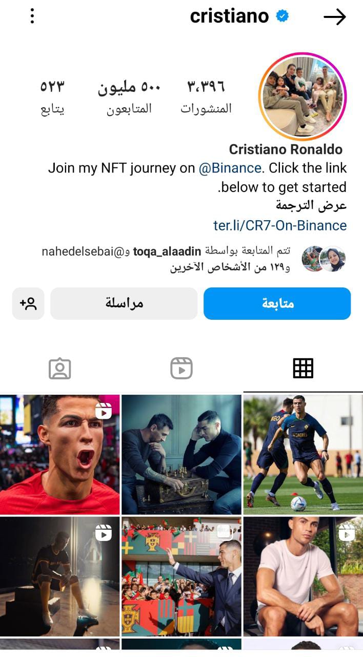وصل اللاعب كريستيانو رونالدو، لاعب منتخب البرتغال وفريق مانشستر يونايتد الإنجليزي، إلى 500 مليون متابع عبر منصة تبادل الصور والفيديوهات إنستجرام.