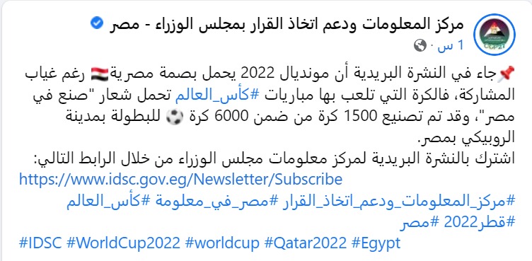 وتابع عبر انفوجراف مرفق بالمنشور: تلعب منتخبات العالم في هذه النسخة من كأس العالم قطر 2022 بكرة قدم صنعت في مصر.